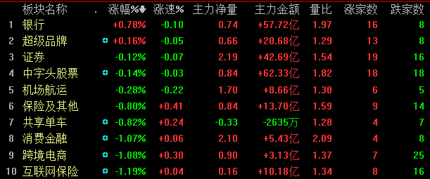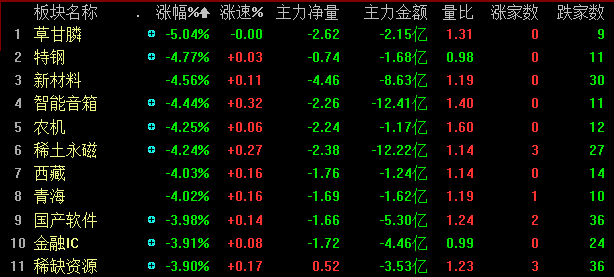 今天基本上延续了昨天的行情,以上证50标的股为代表的权重大盘股表现亮眼,小盘股则延续杀跌行情。两市仅银行、超级品牌两个板块上涨,券商、中字头股票、机场航运板块跌幅较小,保险板块跌幅小于1%。草甘膦板块暴跌5%,领跌两市所有板块;特钢、新材料、智能音箱、农机、稀土板块均大跌4%以上,国产软件、金融IC、稀缺资源、马云概念、氟化工等板块亦有不同程度的大跌。