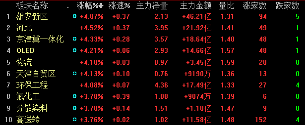 今天市场进入了全面性的反弹,不但沪指重新收复3100点站上年线,创业板指也站上1800点,各个板块更是全面开花。雄安新区领涨两市,暴涨近5%,与雄安高度相关的河北、京津冀、天津自贸区板块亦大涨4%。OLED、物流、环保板块均上涨4%以上,氟化工、分散染料、高送转等板块亦有不同程度的大涨表现。