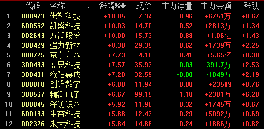在反弹行情中,都会产生一些助攻板块,虽然板块的表现不如主打板块强势,但在反弹行情的前期具有极其重要的作用,今天OLED便充当了这样一个角色。佛塑科技、凯盛科技、万润股份强势涨停,强力新材、京东方A、蓝思科技、濮阳惠成均暴涨7%以上,创维数字、精测电子、生益科技、永太科技的涨幅则均超过5%。