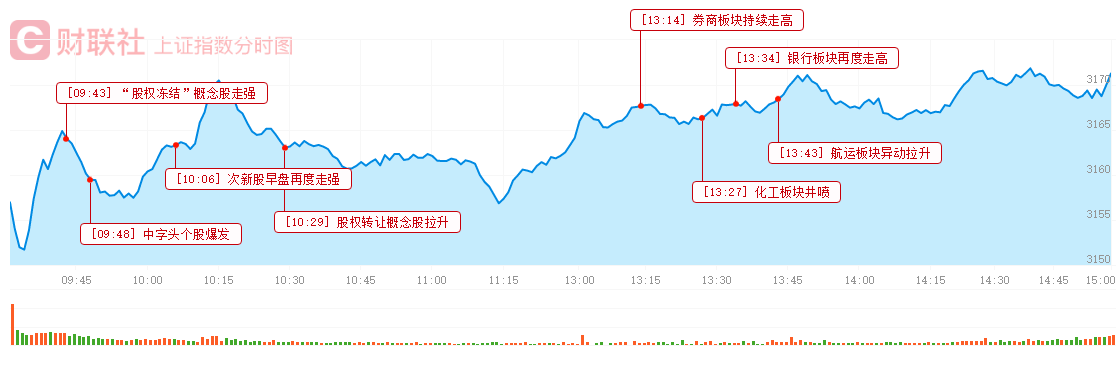 财联社10日讯,今日沪深两市股指双双高开,随后快速走高,只用半小时便完成了全天的涨幅,一举收复昨日的阴线,再度创出此波反弹的新高,此后在高位维持震荡走势。今日大盘放量走高,券商、银行、石油矿业等权重板块功不可没,次新股等题材板块也有不错表现。截至发稿,沪指上涨1.37%,报收3171点;深成指上涨1.16%,报收10821点;创业板上涨0.92%,报收2143点。从盘面上看,次新股、公交、采掘服务、纺织制造等板块涨幅居前;两市仅黄金一个板块下跌,其余板块全线上涨。沪股通净流入16.21亿。