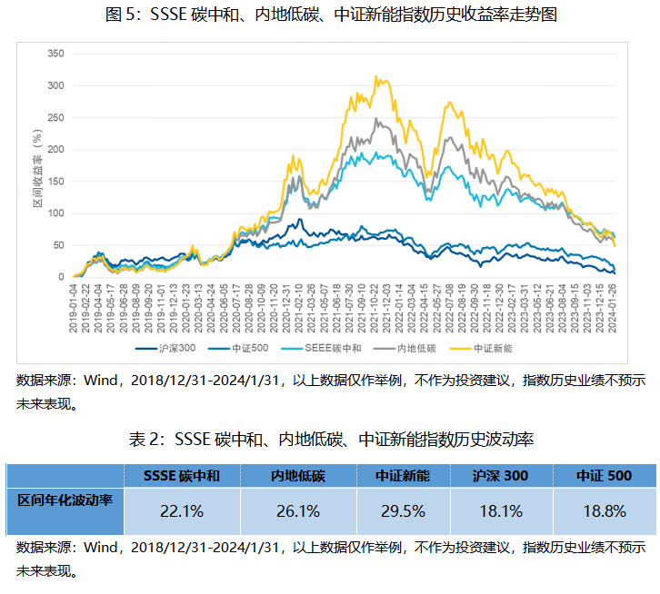 SSSE碳中和、内地低碳和中证新能指数的收益和波动都较高