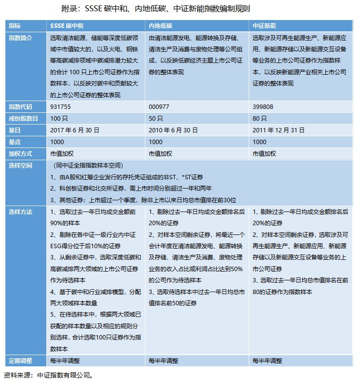 【要点:SSSE碳中和和内地低碳指数更偏大中市值、中证新能更偏中小市值】