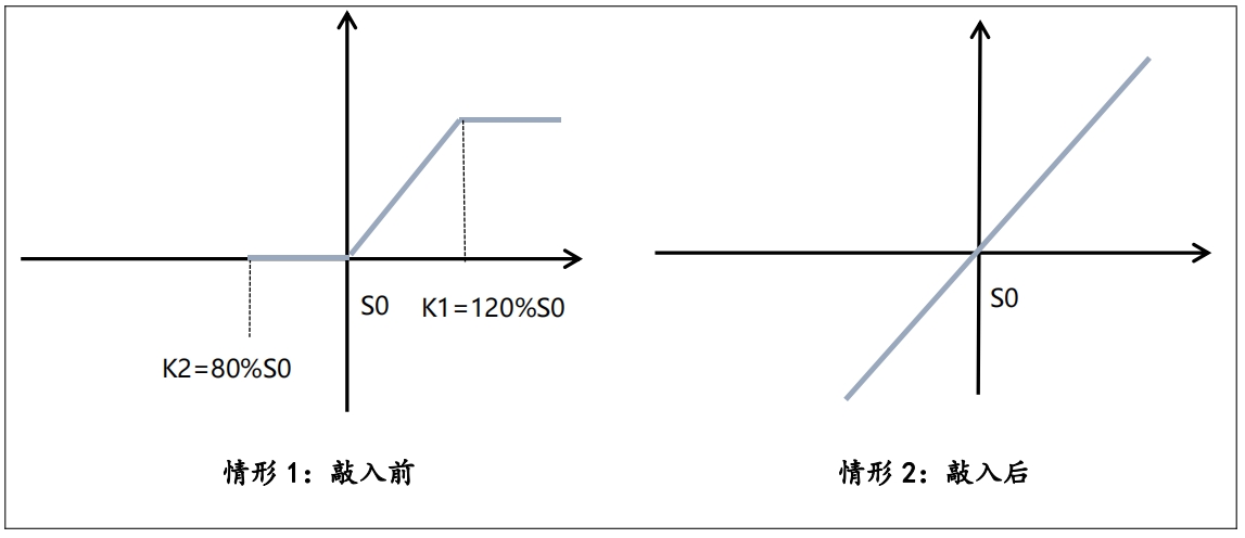 Airbag期权将障碍设置为标的价格的上涨与下跌区间。若标的价格下跌,且跌幅在约定区间内,期权买方不必承担损失;若标的价格下跌,且超过约定区间,则期权买方收益等同于标的涨跌幅;因此其具有有限的下跌保护功能。相反,若标的价格上涨,且涨幅未超过约定区间,期权买方获得标的价格上涨收益;但是,若标的价格涨幅超过约定区间,期权买方仅能获得约定区间上限的收益,无法获得后续超额收益。