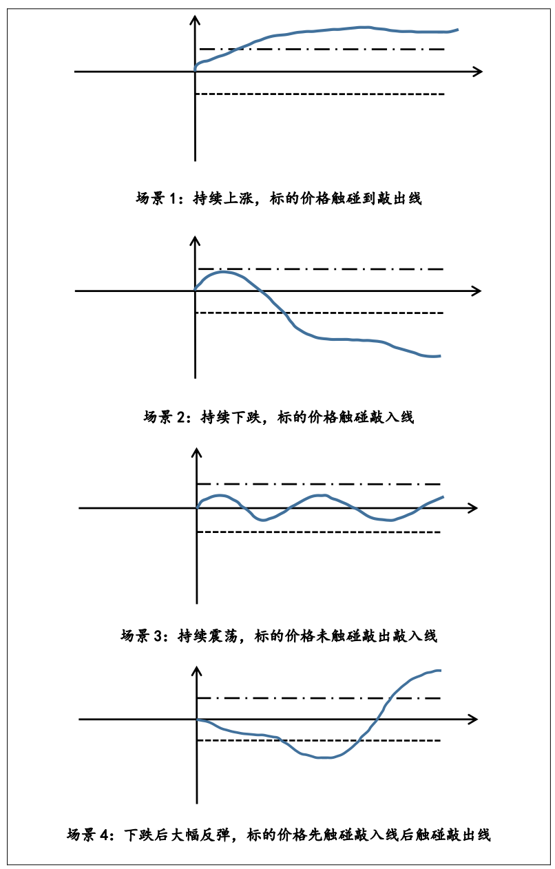 雪球类期权同时设置了敲入和敲出机制,其买方收益主要涉及标的涨跌幅以及波动率,以最简单的情形为例,可归纳为以下四个场景:①持续上涨,标的价格触碰到敲出线:合约提前结束,投资者获得按照年化收益计算的短期收益。②持续下跌,标的价格触碰敲入线:投资者承担下跌亏损。③持续震荡,标的价格未触碰敲出敲入线:投资者持有至到期,持续获得固定收益。④下跌后大幅反弹,标的价格先触碰敲入线后触碰敲出线:合约提前结束,投资者取得按照年化收益计算的短期收益。