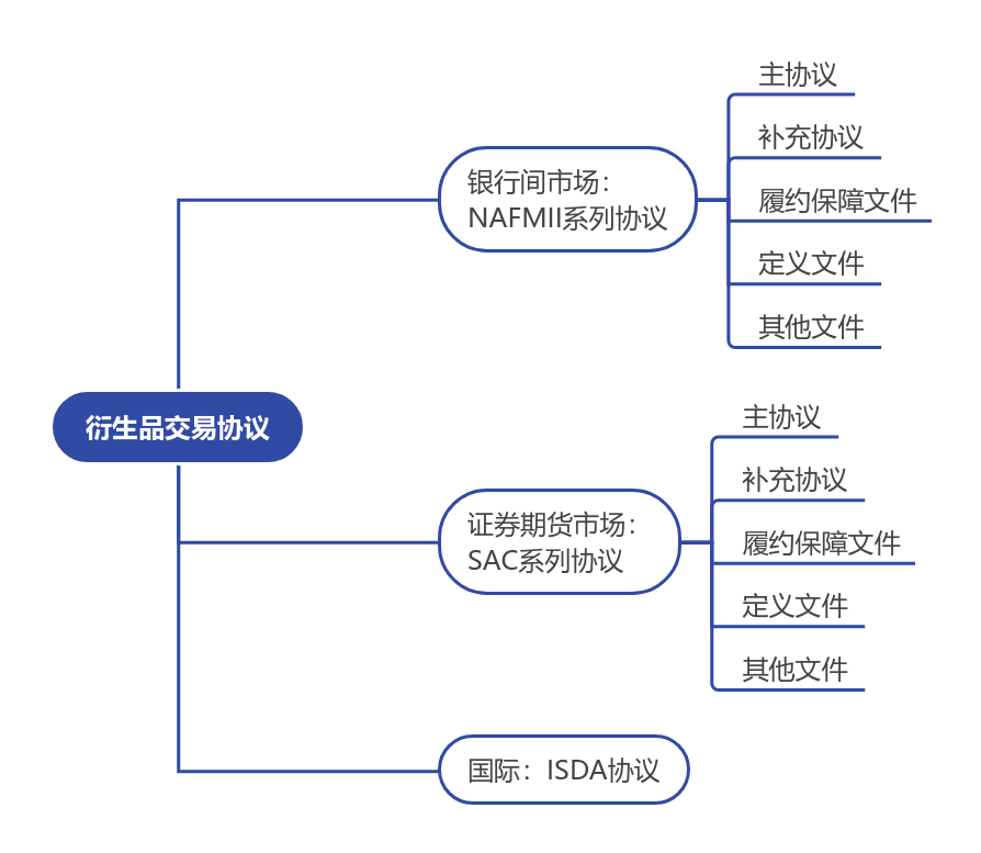 包括主协议、补充协议、履约保障文件和定义文件等,其中NAFMII主协议是绝对的核心。NAFMII主协议全称为《中国银行间市场金融衍生产品交易主协议》,具体适用范围包括利率衍生产品、汇率衍生产品、债券衍生产品、信用衍生产品、黄金衍生产品及衍生产品交易组合等市场参与者之间以一对一方式达成的、按交易双方具体要求拟定交易条款的金融衍生合约1。