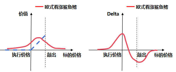 下面是一个欧式看涨期权(左图)和欧式看跌期权(右图)的Delta示意图。相较于其他结构复杂的期权,香草期权的Delta有比较固定的特征。欧式看涨期权的Delta在0到1之间单调递增,平值期权的Delta处于0.5左右;而欧式看跌期权的Delta在-1到0之间单调递增,平值期权的Delta处于-0.5左右。