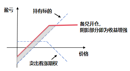 备兑开仓是一种相对比较保守的投资策略,它相当于以损失标的大幅上涨的收益为代价,换来震荡期间的收益增强。如下图所示,当标的价格小涨或不涨时,投资者获得的期权费收入成为额外收益的来源,也即阴影部分的收益增强。当标的价格上涨超过执行价后,标的继续上涨的收益被期权端的损失全部抵消,组合利润维持不变。