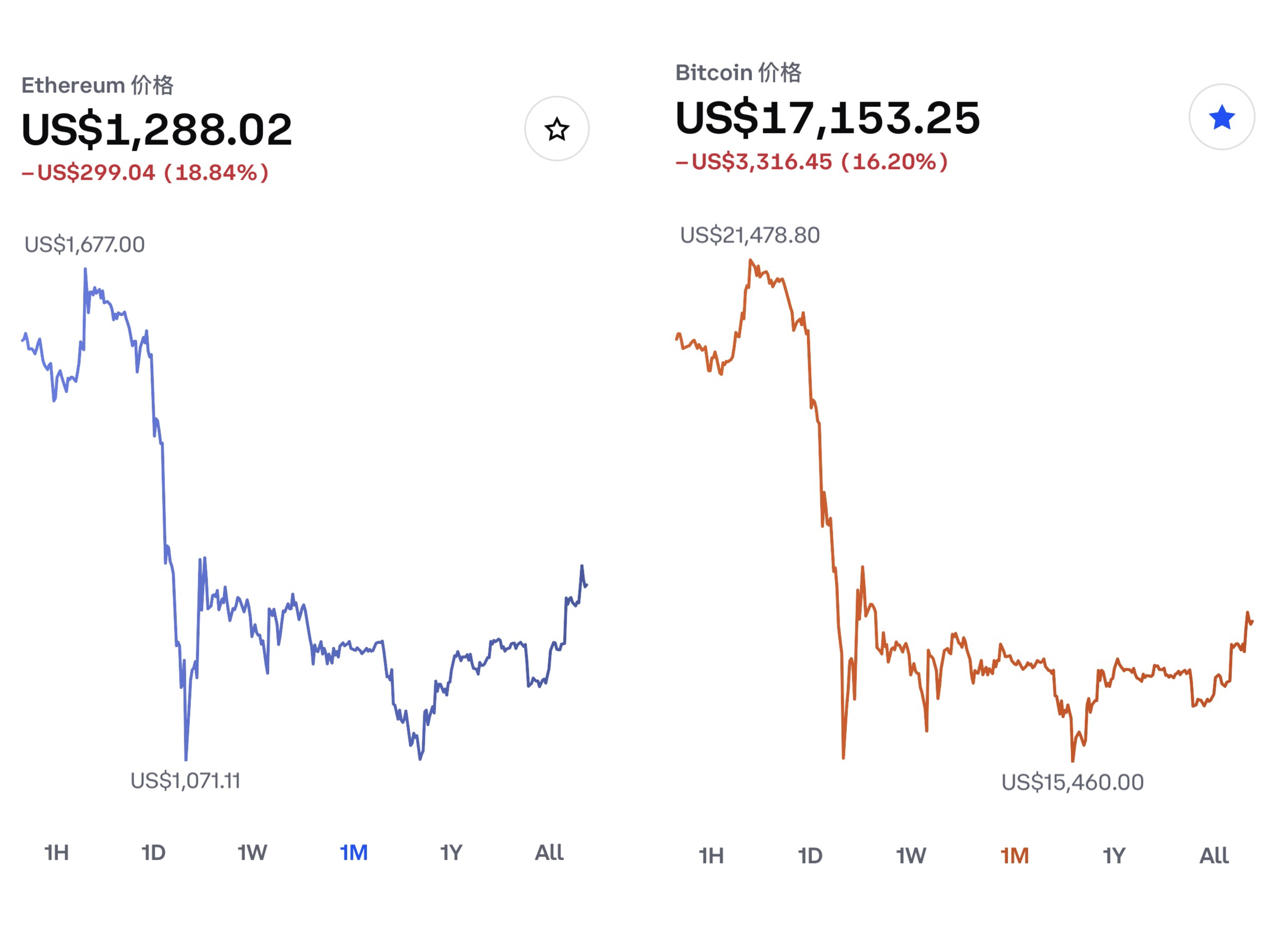 比特币(右)和以太坊(左)一个月内价格走势。图片来自Coinbase