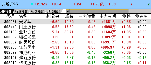 盘面上看,尾盘分散染料概念股快速拉伸,安诺其、闰土股份、亚邦股份都直线拉升涨逾5%,浙江龙盛、航民股份等也有较好表现。在弱市之中,一个板块能有这样的表现往往意味着非常强势,所以分散染料板块后市还是存在一定机会。
