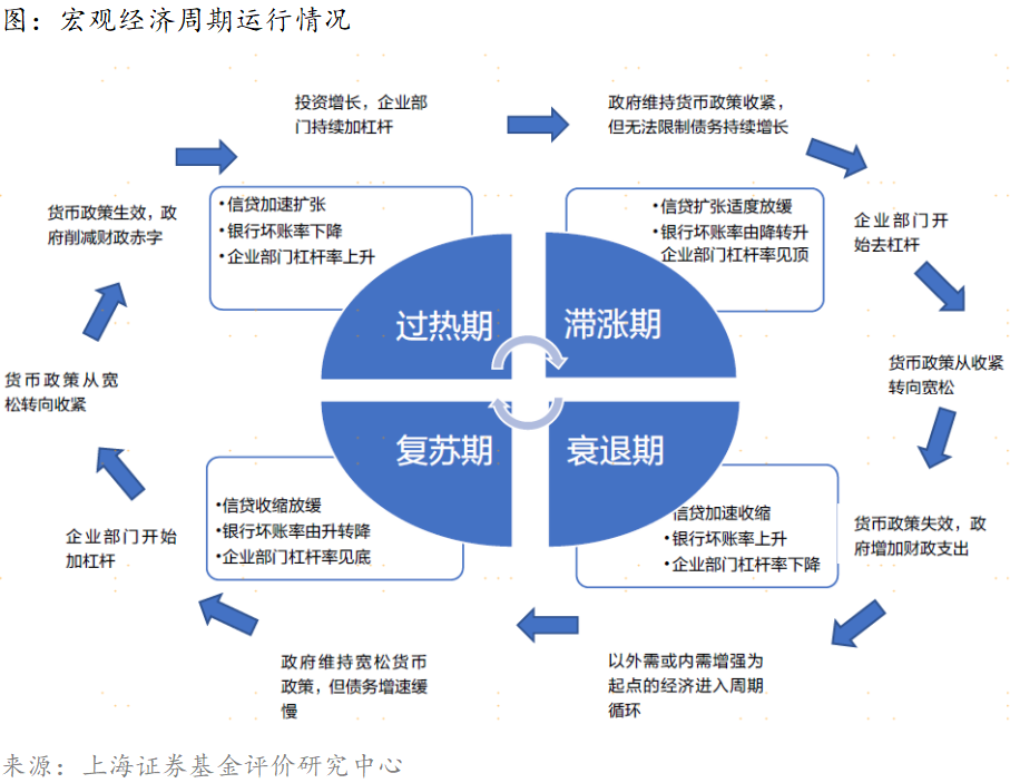 经济的周期性波动,通常体现在过热、滞胀、衰退和复苏之间循环反复。
