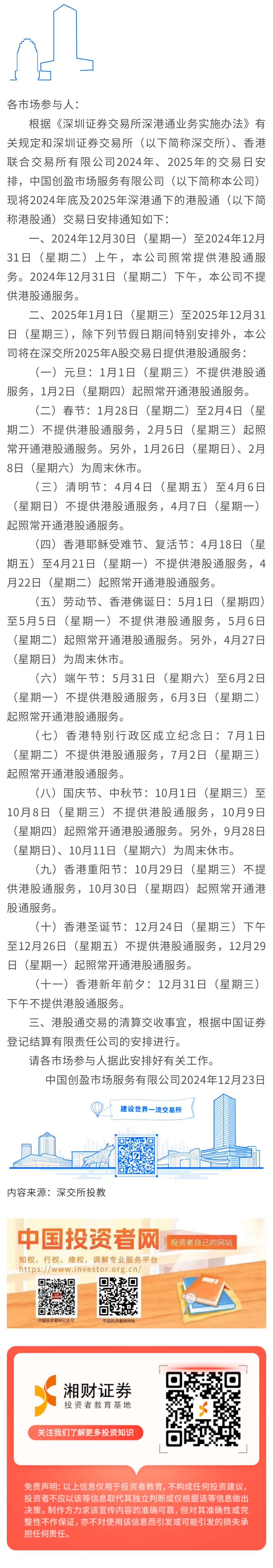 【深交所投教】关于2024年底及2025年深港通下的港股通交易日有关安排的通知