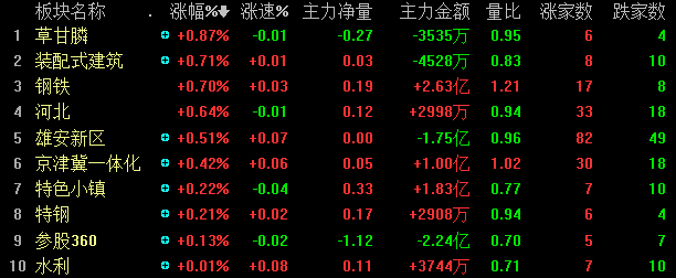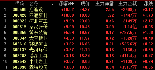 在一片调整行情中,雄安新区概念股成为了一个不一样的群体,逆势拉升走强。启迪设计、四通新材、河北宣工、京汉股份强势涨停,冀东装备大涨5%,太空板业上涨4%,韩建河山、先河环保、博深工具、中化岩土、森特股份等个股均有不同程度的上涨。