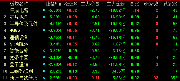 市场今天再现大、小盘股集体调整的行情,无论是蓝筹白马股,还是之前的热点板块——5G板块,均出现大幅杀跌的现象。两市仅草甘膦、装配式建筑、钢铁、雄安新区、水利等10个板块上涨,且上涨幅度均不超过1%。相比涨幅榜的小幅上涨,跌幅榜上的板块下跌幅度要惨烈的多。芯片概念暴跌5%,与芯片概念高度相关的集成电路、半导体板块亦有暴跌;5G概念、机场航运、智能音箱、宽带中国板块均大跌3%以上,量子通信、二维码识别、次新股、超级品牌等板块亦有不同程度的大跌。