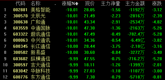 在蓝筹白马股调整的同时,小盘题材股也不能幸免,5G概念股首当其冲。美格智能、太辰光、广和通、中国通脉、超讯通信、长江通讯、吉大通信等逾10只5G概念股封死跌停板,剑桥科技、天孚通信、大富科技几近跌停,中富通、武汉凡谷、英维克、通宇通讯等个股亦有不同程度的大暴跌。