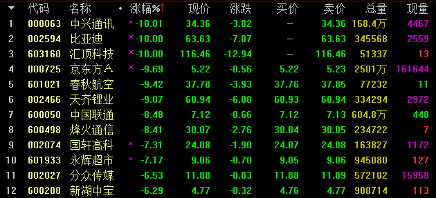 虽然蓝筹白马股的跌幅没有5G概念股大,但市场的关注焦点依然在蓝筹白马股上。中兴通讯、比亚迪、汇顶科技封死跌停板,京东方A、春秋航空、天齐锂业几近跌停,中国联通、烽火通信、国轩高科、永辉超市均暴跌7%以上,分众传媒、新湖中宝、美年健康、中国国旅、南方航空、石基信息等个股亦有不同程度的大跌。