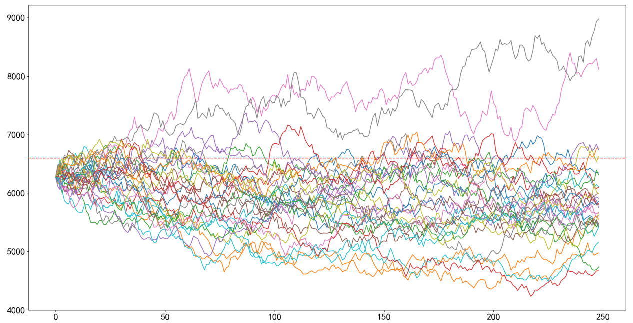 图1使用蒙特卡罗模拟生成价格路径(选取30条),可以看出仅少数路径于不同时间点触及敲出(高于红色水平虚线)。极端情形下,标的下跌将近30%(最底部红色实线,模拟情景可能与实际情况存在差异)。