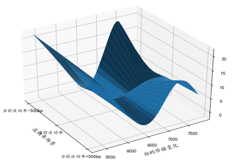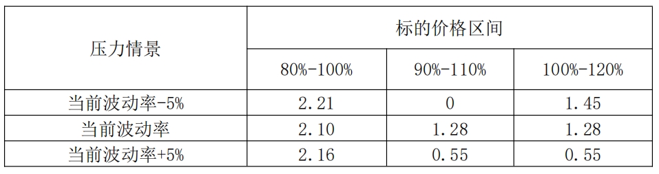 假设挂钩标的价格变化范围为80%-120%,其中每2%为一个最小变化单位;波动率变化幅度分为-5%、0%和+5%三档。标的结合波动率变化共计63个情景。