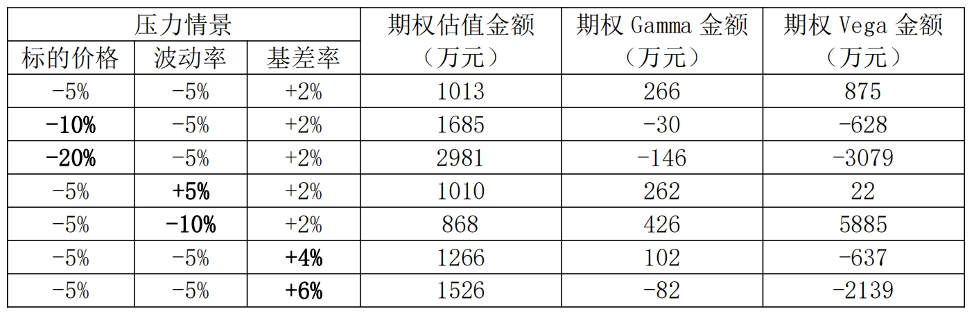 假设中证500指数当前波动率为20%,流动性压力测试情景为标的波动率变为当前波动率*0.5(即10%)和当前波动率*2(即40%)。