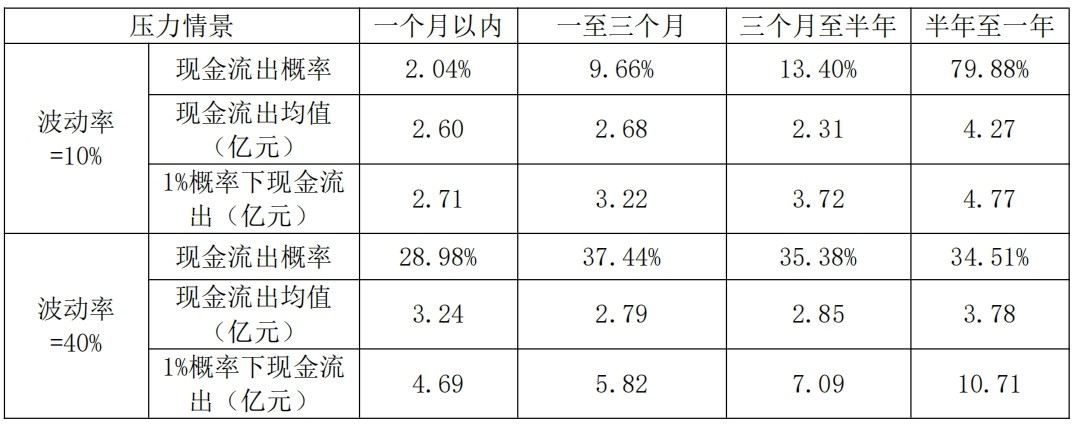 压力测试结果显示,波动率增加,短期资金流出的概率增加,现金流出均值和1%概率下现金流出值均会增加。案例中在极端情形下可能造成4.7亿短期资金流出和10.7亿长期资金流出。证券公司应根据市场波动情况动态预估潜在流出金额,提前通知资金管理部门;资金管理部门也应结合公司其他各业务的资金需求、债务到期及正常运营开支等情况评估公司资金头寸及现金流,提前做好规划与安排,确保能够及时满足公司流动性需求。