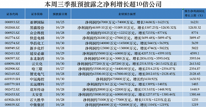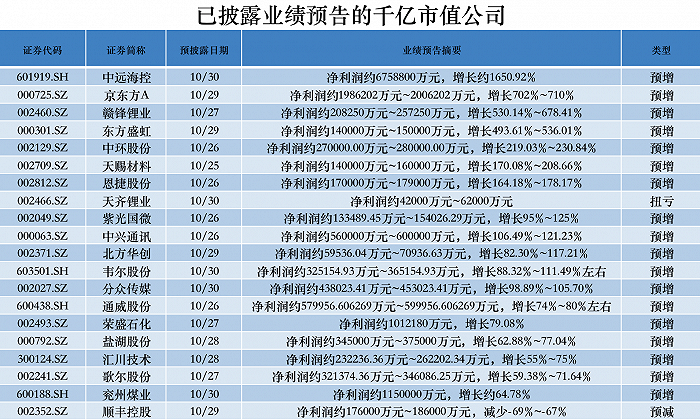 在已披露业绩预告的千亿市值公司中,中远海控(601919.SH)预计前三季度净利润最高增长超16倍,京东方A(000725.SZ)、赣锋锂业(002460.SZ)、东方盛虹(000301.SZ)预计净利同比最高增长5-7倍,中环股份(002129.SZ)、天赐材料(002709.SZ)、恩捷股份(002812.SZ)、天齐锂业(002466.SZ)等业绩增长翻倍。