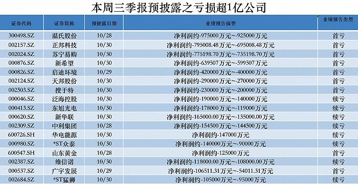 17家公司最高亏损金额超过1亿元,温氏股份(300498.SZ)预计前三季度亏损97.50亿元,正邦科技(002157.SZ)预计亏损79.50亿元,苏宁易购(002157.SZ)预计亏损77.52亿元,新希望(000876.SZ)亏损63.95亿元,启迪环境(000826.SZ)亏损42亿元,天邦股份(002124.SZ)亏损29亿元,搜于特(002503.SZ)亏损23亿元,此外,泛海控股(000046.SZ)、东旭光电(000413.SZ)、新华联(000620.SZ)、中利集团(002309.SZ)、华电能源(600726.SH)等均亏损超1亿元。