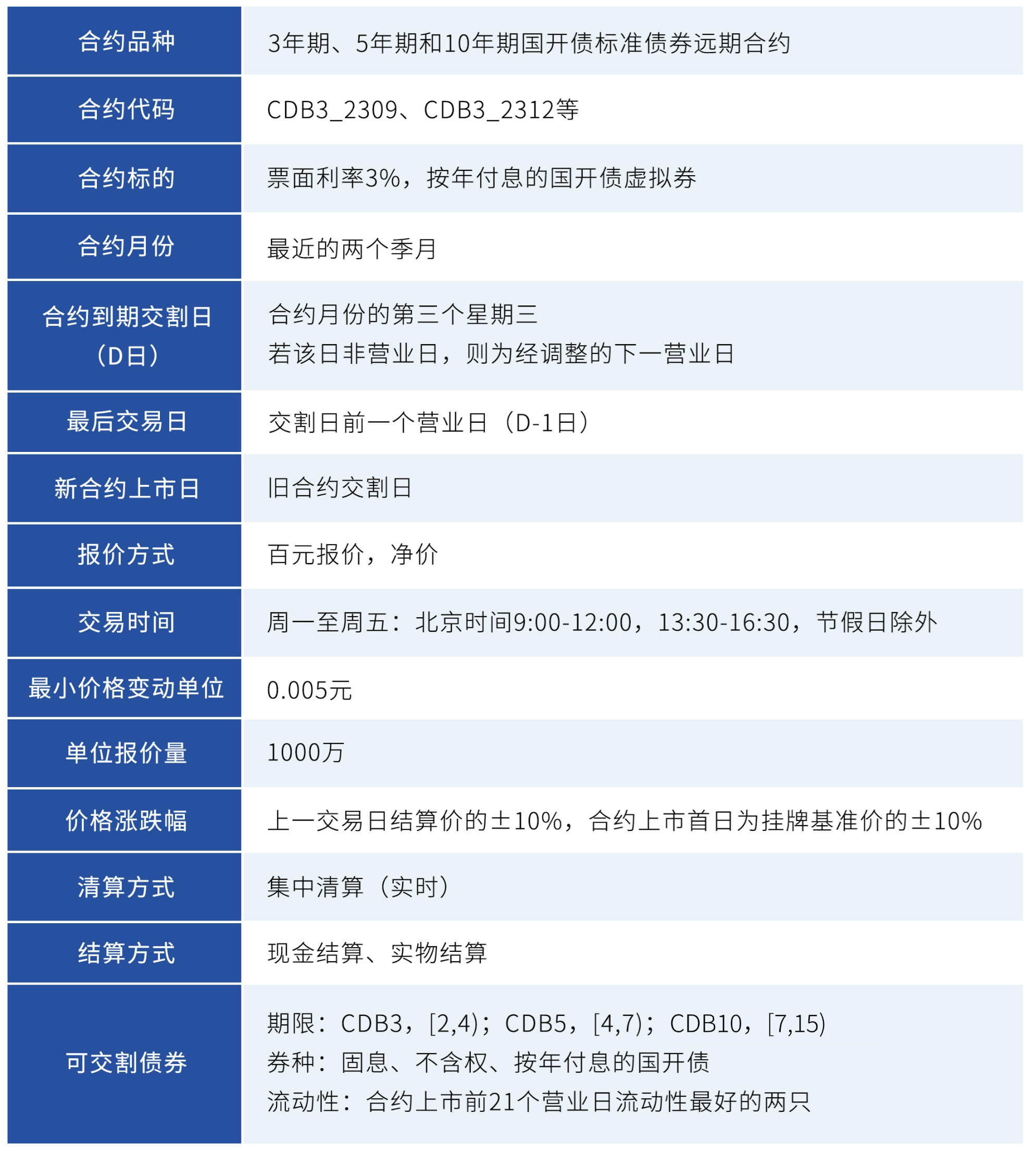 标的券种方面,现金交割合约以3年、5年、10年国开债或农发债为标的,实物交割合约以2年、7年国开绿债或农发清发债为标的。