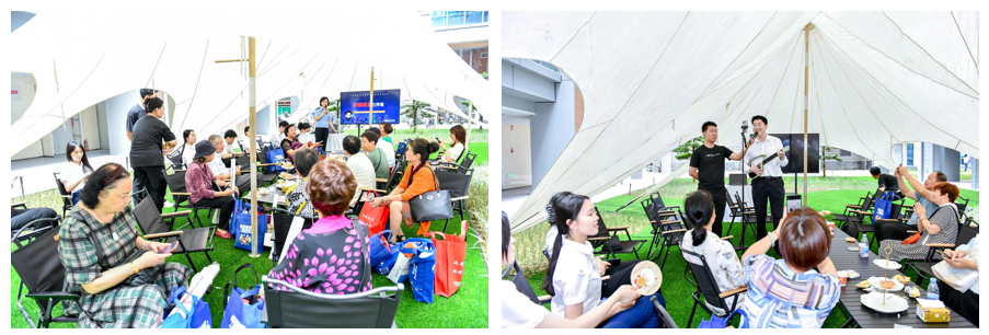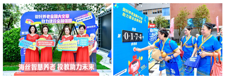 在集市入口,有专门的打卡拍照,并设置互动按压装置,参与者通过按压按钮,互动装置就会显示“我是第X位参与者”,在参与活动的第一时刻,就将参与者带入到“投教助力智慧养老”的主题活动氛围之中。适逢福建老年大学毕业汇演,不少人都身穿演出服,成为现场一道道亮丽的风景。