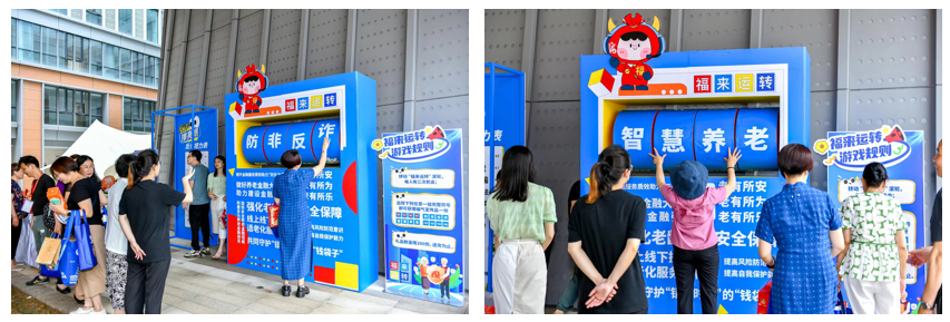 在“福来运转”滚轮区,每位参与者可以滚动三次,出现完整的金融理财术语即算成功。在投教知识问答谜题摊位,参与者可以选择谜题向工作人员进行答题。