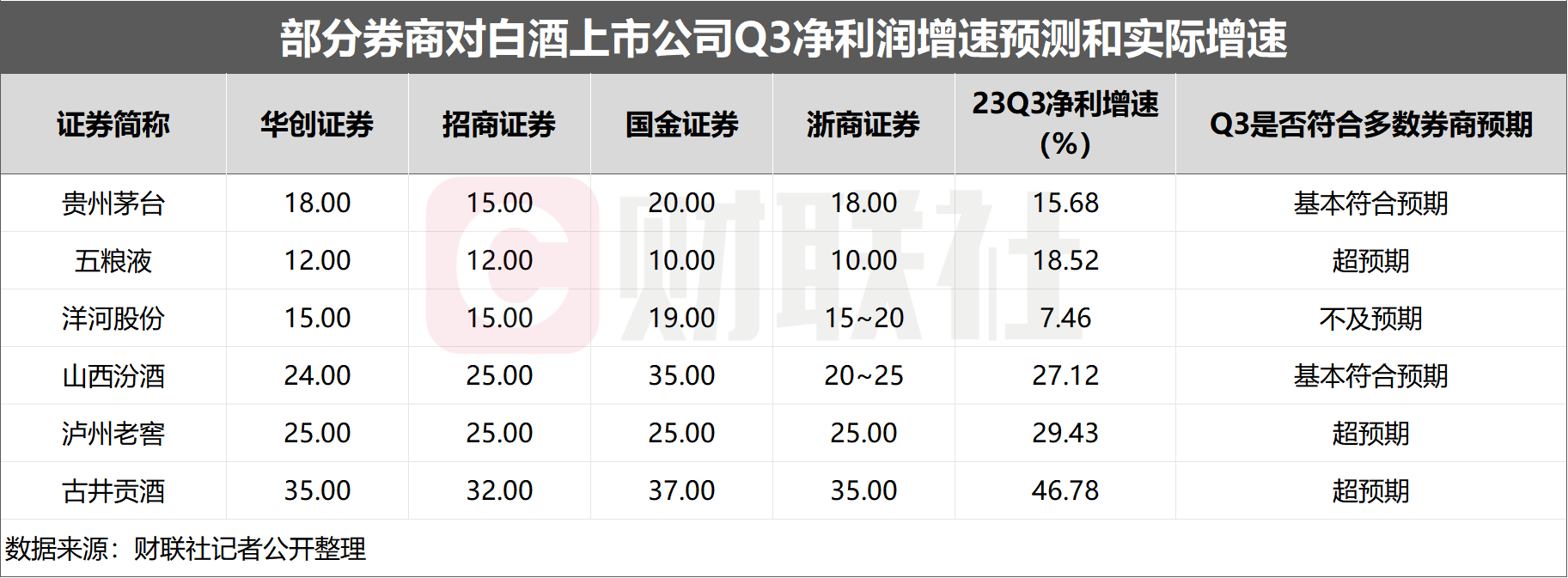除洋河股份外,一线白酒龙头Q3业绩表现也普遍好于券商预期。以五粮液为例,梳理公开资料显示,此前申万宏源、华创证券、招商证券、国信证券、国金证券、浙商证券分别预计五粮液Q3净利润增速为10%-12%;但实际上五粮液Q3净利润增速达到18.57%,远高于上述六家券商的预期。