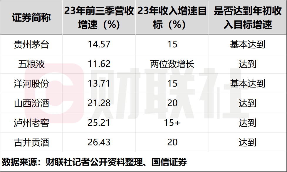 而对于年初披露的业绩目标来看,今年前三季度,TOP6白酒企业不仅都实现营收双位数增长,而且基本都达到了年初的目标增速。