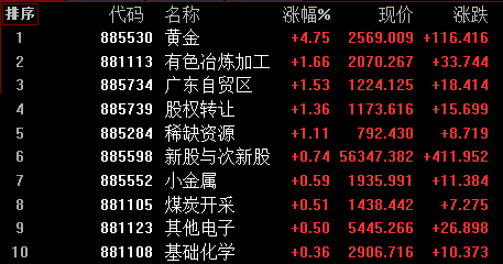得益于美国大选的因素,黄金板块今天迎来大爆发,大涨近5%。虽然有色板块紧随其后,但考虑到多只黄金概念股同样也是有色板块的标的个股,因此有色板块的涨幅存在一定的水分。广东自贸区、股权转让均上涨超1%,次新股、煤炭、基础化学等板块相对而言涨幅较小。