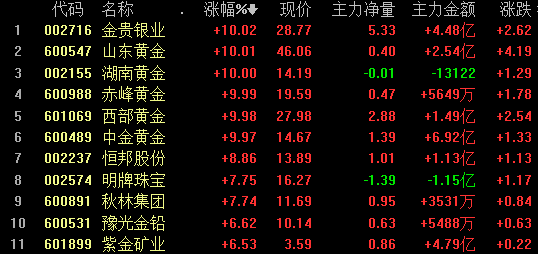 可以说今天的美国大选成就了黄金板块的爆发,板块内多只个股涨停。金贵银业、山东黄金、湖南黄金、赤峰黄金、西部黄金、中金黄金午后纷纷先后涨停,恒邦股份暴涨8%,明牌珠宝、秋林集团均大涨7%,豫光金铅、紫金矿业等个股亦有不同程度的大涨。