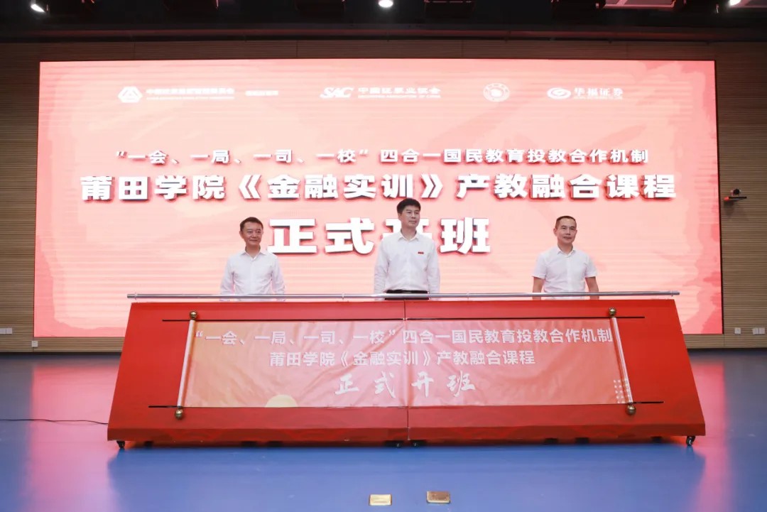11月15日,莆田学院《金融实训》产教融合课程开班仪式在莆田学院举行。该课程的合作汇聚了“一会(中国证券业协会)、一局(福建证监局)、一司(华福证券)、一校(莆田学院)”四方力量,共同搭建起一个资源丰富、实战导向的金融教育平台。福建证监局法治处处长洪烨灵,莆田学院党委常委、纪委书记戴祐坤,华福证券党委委员、副总裁张贵云等出席仪式,共同推杆开启产教融合新篇章。