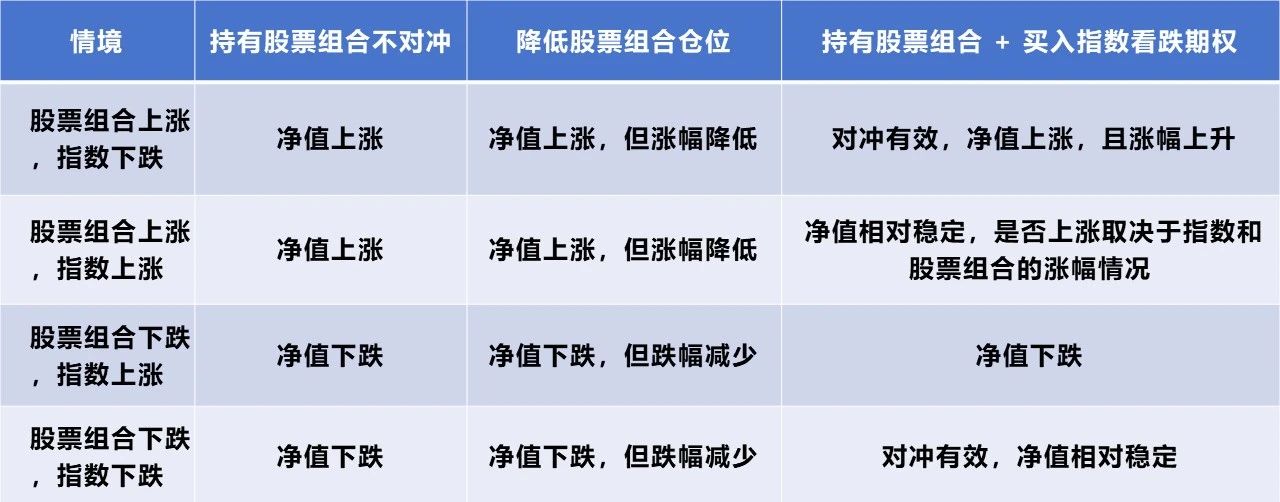 对冲存量组合下跌风险。对于持有一篮子股票的投资组合,当投资者认为短期上涨存在压力或存在一定回调压力的情况下,可以通过买入看跌期权的方式,对冲市场整体的Beta风险。相比于以减仓的方式规避下跌风险的方法,通过买入看跌期权进行下跌风险保护,可以在对冲市场下行风险的情况下,同时保留股票篮子的上涨收益,同时降低判断失误带来的风险。