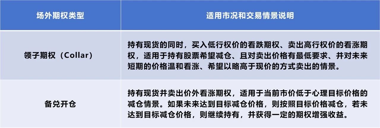 减仓时期的风险保护。在减仓时期,投资者的普遍诉求是希望以更好的价格减仓或者降低对市场的冲击,基于场外期权策略的减仓通常是以时间换空间的方式,平滑市场波动,并利用市场波动的交易机会,获得更好的卖出价格和增强收益。