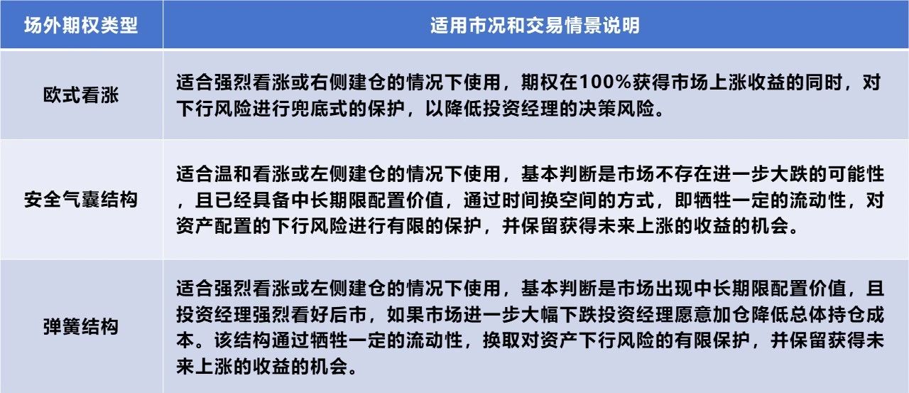 建仓时期的风险保护。在建仓时期,便根据投资观点考虑持仓期间的风险保护措施,不同场外期权类型可满足左侧建仓、右侧建仓、强烈看涨、温和看涨、优化建仓成本等多种场景需求。
