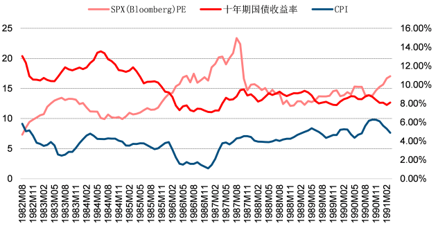 图:美国通胀、国债收益率与股市估值的比较(68-82)
