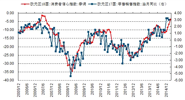 我们在去年的报告中曾经分析,欧元区经济在去年下半年的持续回落主要是由于外部因素冲击所致,是西方国家因乌克兰问题与俄罗斯交恶(当然也有中国和日本景气持续低迷的影响),造成了欧洲出口与投资信心回落。对于欧洲经济之所以在去年12月以来能扭转景气颓势,我们认为除了乌克兰问题阶段性有所缓和,更重要的是其内部消费需求一直保持不错的回升态势,并且欧央行针对景气的不断回落祭出了QE大器。欧央行承诺的超万亿的QE刺激计划进一步将银行间拆借利率压到了零轴之下,且使市场相信负利率会存在相当长的一段时间,进而激发了欧洲金融机构向市场投放信贷的积极性。