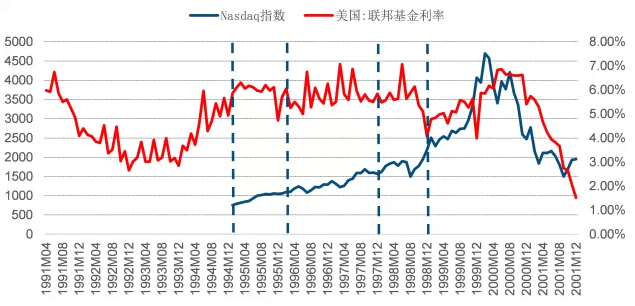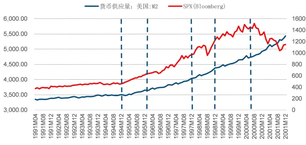 1999年第三库存周期之后,格林斯潘逐渐提高了联邦基准利率,这是内生于不断有抬头趋势的通货膨胀数据的,是周期运动的结果所导致的。90年代,美联储政策已经从盯住货币总量转为了盯住目标利率。格林斯潘虽然对于通货膨胀价格指数以及雇佣成本指数保持着高度的敏感性,有抬头趋势则迅速抬高利率,但是90年代的“高增长、低通胀”环境还是使利率保持了低位,同时货币总量不断攀升,实体经济中充斥中充裕的流动性,支持了繁荣的资产价格。当美联储在1999年提高利率之际,股市没有被收紧的利率所影响,这是周期本质所决定的。虽然走高的国债收益率限制了蓝筹股的估值水平,但是实体经济中充足的流动性还是纳指泡沫充分的保障。