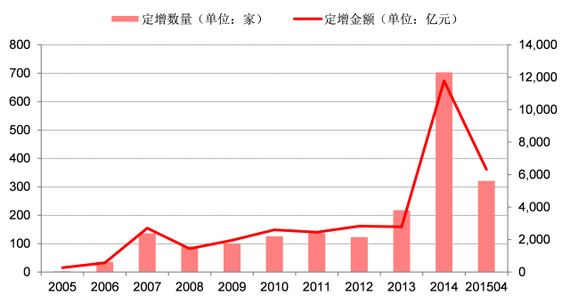 总体来看,定向增发井喷式发展。受IPO限制,2013年A股市场IPO几乎为0,但全年定增企业达218家,同比增长77.24%;2014年IPO仅15家,全年定增企业达703家,同比增长222.48%,当年A股上市企业共2596家,即约27.08%的上市公司进行了定向增发。
