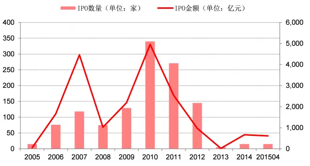 图:历年IPO发行数量及金额(截止15年4月17日)