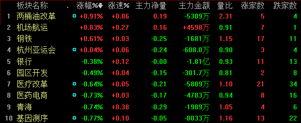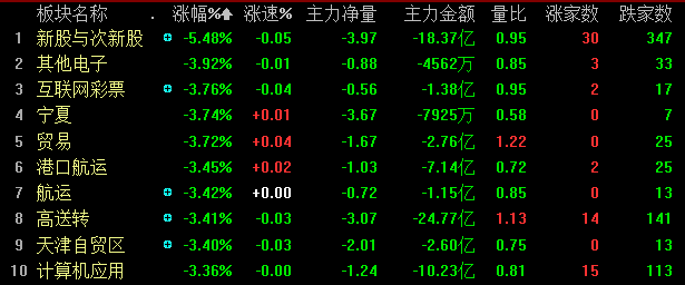今天沪指持续调整,两市上涨的板块仅4个,其余板块全线下跌,以次新股为代表的小盘股成为今天的重灾区。两桶油改革、机场航运、钢铁、杭州亚运会仅4个板块上涨,且上涨幅度均未超过1%。次新股成为调整的重灾区,暴跌5%以上;互联网彩票、贸易、港口航运、高送转、天津自贸区、计算机应用等板块亦有不同程度的大跌,均大跌3%以上。