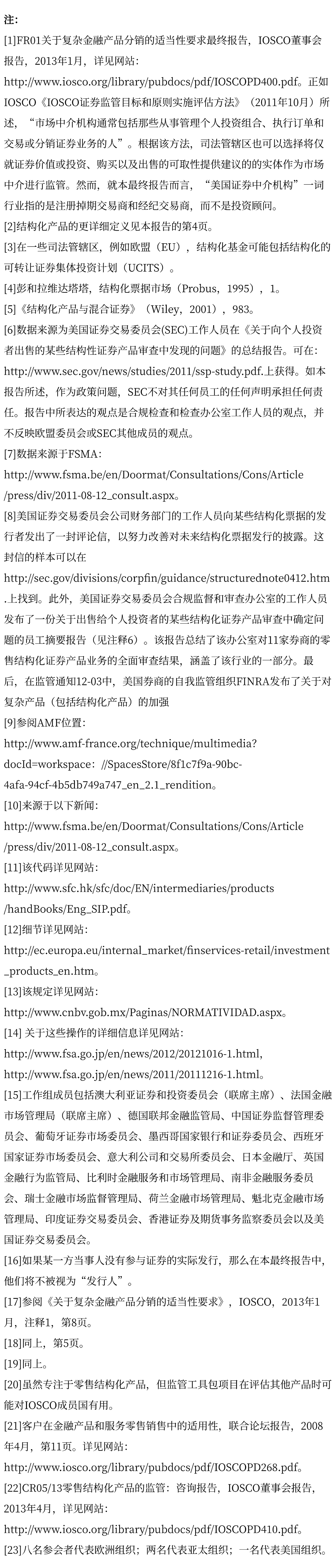 如上所述,IOSCO于2013年1月发布了关于分销的《适当性要求》。《适当性要求》的目的是“……促进与中介机构在复杂金融产品经销中提供强有力的客户保护,包括关于如何实施适用的适当性要求的指导。[17]《适当性要求》对“复杂金融产品”的定义广泛,其中包括“结构化产品”。[18]