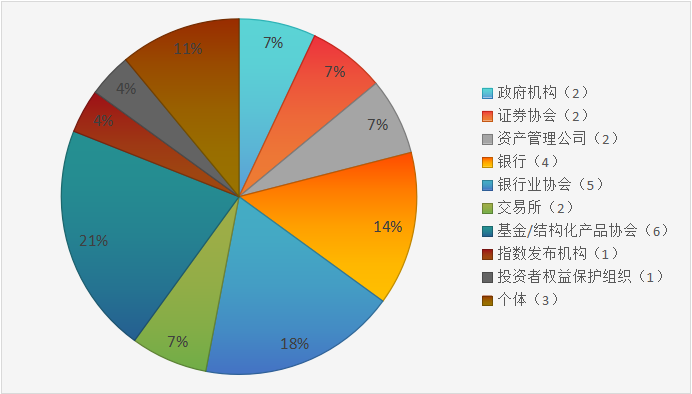 咨询报告收到了来自28份不同实体的回复。大多数回复来自行业协会,其中包括银行协会和基金/结构化产品相关协会。绝大多数受访者(17人)来自欧洲。以下是受访者类型的详细列表。