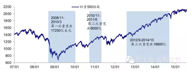 持续的降息加三轮QE,流动性充裕启动资金牛市。07年4月开始,美国爆发次贷危机,政府、美联储出手救市。07年9月开始至08年12月,迅速降至接近0利率;此外,08年底开始,美联储进行了共计三轮的量化宽松(QE),第一轮量宽从08年11月至10年3月,共购买资产17250亿;第二轮量宽从10年11月至11年6月,共购买资产6000亿;第三轮量宽从12年9月至14年10月,共购买资产19900亿。持续降息加三轮QE,推动美国股市触底反弹并持续上涨,美国市场迎来了一轮大牛市,其中三轮宽松出现三轮明显上涨,非宽松期出现震荡。