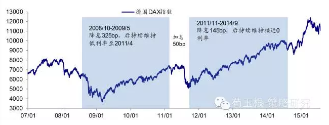 宽松开启资金牛市,短暂加息出现回调。为了应对突如其来的全球金融危机,欧洲央行自08年10月15日至09年5月13日下调基准利率325bp。其后,欧洲央行维持1.00%的低利率近两年之久。11年4月13日,为了控制通胀,欧洲央行重启加息25个基点,至1.25%;7月13日再次加息25个基点,至1.50%。期间,德国股市中经历了一轮回调。但是,更高的利率加重了债务危机国的负担,并拖累了欧洲经济增速,使得欧洲央行不得不在11年9月暂停了紧缩步伐,并于10月初启动了宽松政策。11年11月9日欧元区主导利率下调25个基点至1.25%,从此,欧洲进入降息周期,欧元基准利率逐步降至0附近随着欧央行的利率下行,货币政策持续稳定宽松,德国股市迎来稳定的大牛市,德国DAX指数一路上涨,09年至今涨幅约为126%。两轮降息带来两轮明显上涨,中间加息出现回调。