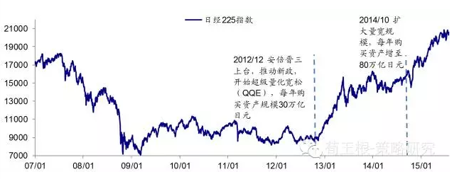 前期长期停滞,后超级量化宽松开启牛市。金融危机爆发后,日本经济陷入了更大的停滞和通缩。由于此前日本一直处于经济停滞和持续通缩期,利率持续维持在小于1%的位置,此轮危机爆发后,央行再次将利率降至0附近。然而这种小幅降息并未带来资本市场的繁荣和经济的好转,日经225指数一直维持在低位震荡。12年底,安倍晋三上台后退出了一些了刺激政策,尤其是13年4月,安倍开始了超级量化宽松计划,计划每年购买资产30万亿日元,为市场提供大量流动性,股市应声而起,日经225指数从12年底到13年5月上涨80%。此后股市陷入震荡期,直到14年10月,量化宽松规模策扩大至每年80万亿日元,股市才再次步入上升通道,日经225指数从14年10月至今涨幅39.9%。