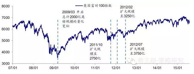 危机后迅速反弹,后温和上涨。危机爆发后,英国央行迅速下调基准利率,从08年2月的5.5%迅速下调,至09年3月已下调至0.5%的低位,此后长期保持低利率不变。09年3月,推出了英版的量化宽松政策,计划未来购买资产2000亿英镑。低利率加量宽政策,股市经历一波强劲反弹,09年3月至10年4月,富时100指数涨65%,涨至5825点。此后11年底至12年,量宽规模略微扩大,政策温和,股市温和上涨。